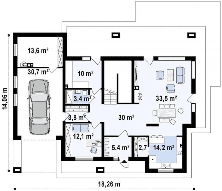 Двое ворот, 260 х 224 см, ведут к гаражной части, запланированной на первом этаже. Внутри можно легко припарковать три машины, есть также место для велосипедов, косилок, мотоциклов или другого оборудования. Дополнительные функции хранения или небольшой мастерской будет выполнять небольшое подсобное помещение, размещенное в углу гаража.