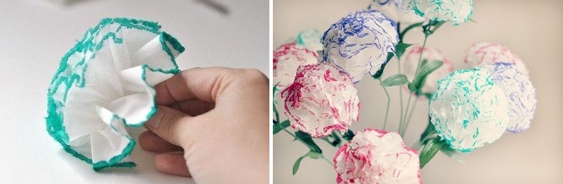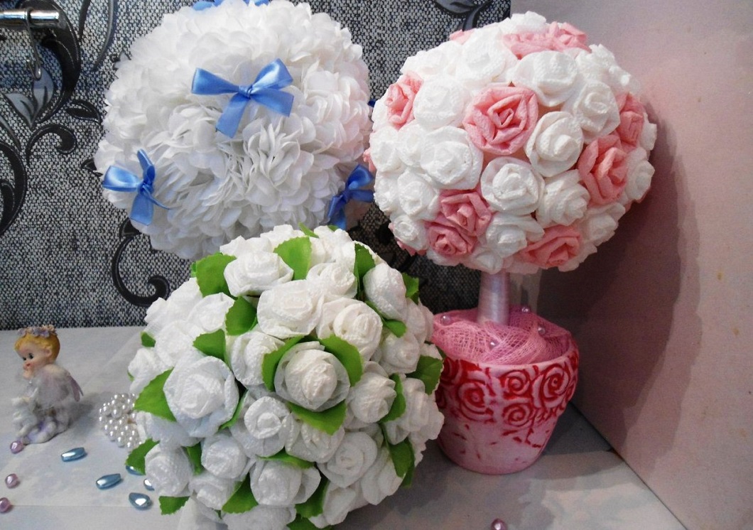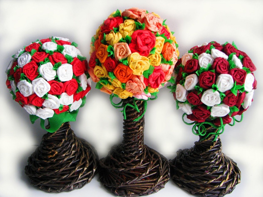 Основу готовят так, как в любом другом случае – емкость, заполненная гипсом или пенопластом, веточка, крона из бумаги или папье-маше. Салфетки используются для украшения. Особенно удобно делать из них цветы: георгины и гвоздики. Также используются классические бумажные цветы.