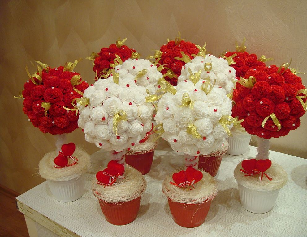 Романтика Святого Валентина. Влюбленное дерево или топиарий сердце, оформленный в красно-белой гамме и украшенный атласными или бумажными розами, валентинками, пушистыми перышками, станет настоящим романтическим подарком.