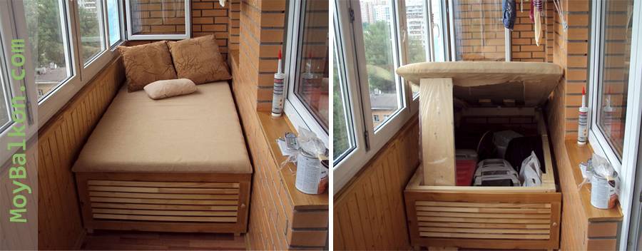 Диванчик-кровать очень подходит для узких балконов, какие бывают в старых домах. Раскладывается он выдвижением нижней части, а спинка опускается на место сиденья. Спать ночью на таком диванчике не очень удобно, зато днем это очень удобное место, чтобы прилечь и отдохнуть, послушать музыку. О том как сделать подвесную кровать (гамак), написано здесь.