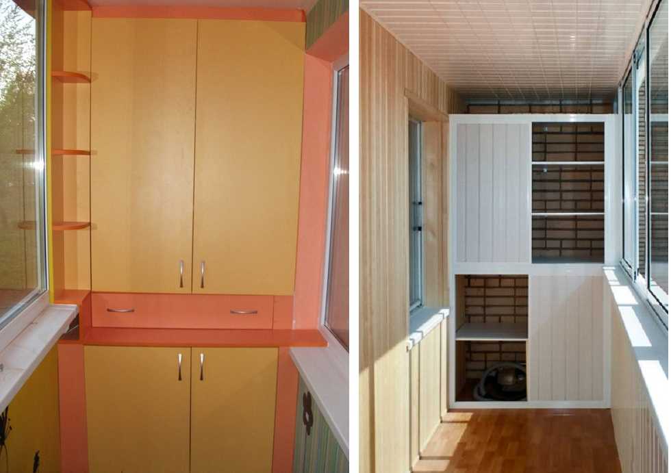 Надо отметить, что на балконы, возле торцевой стены, часто устанавливают встроенный шкаф, его каркас рекомендуется изготовить из дерева или фанеры, а вот фасады шкафа можно сделать как деревянные распашные, так и подъемные ролеты или раздвижные купейные, из пластика или стекла.