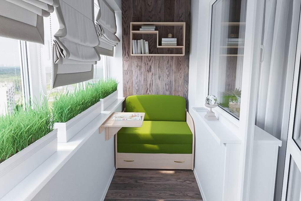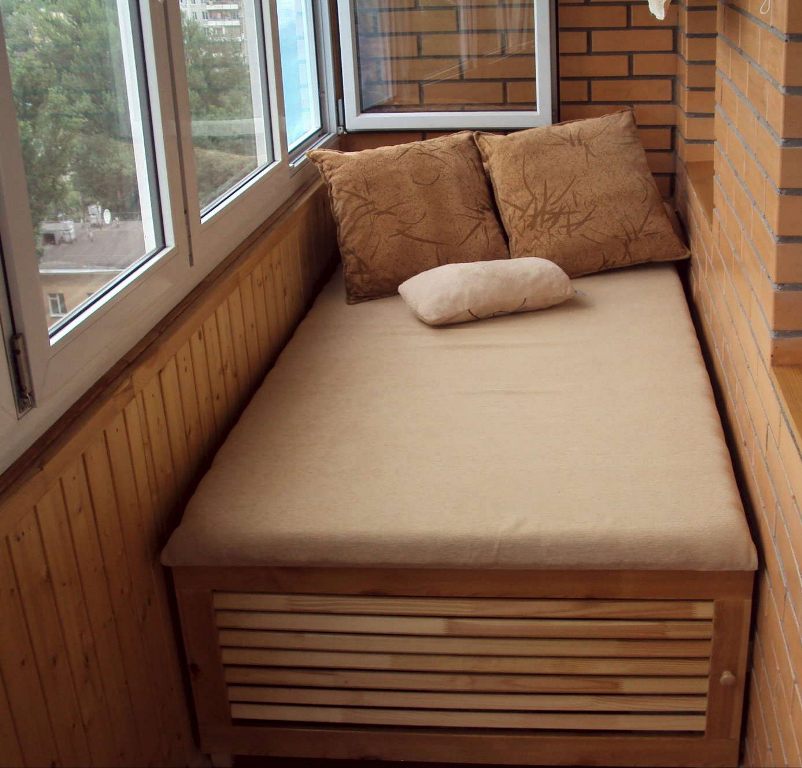 Такой вариант идеален для любителей отдыха на свежем воздухе, а точнее для тех, у кого нет возможности часто выбираться на прогулки. Помимо этого дополнительное спальное место пригодится тем, кто часто приглашает к себе гостей с ночевкой. При выборе такого дивана стоит учитывать то, что раскладываться он должен вперед, но на такую длину, чтобы оставалась возможность передвижения по балкону. Изготовить его самостоятельно без наличия определенных навыков не получится.
