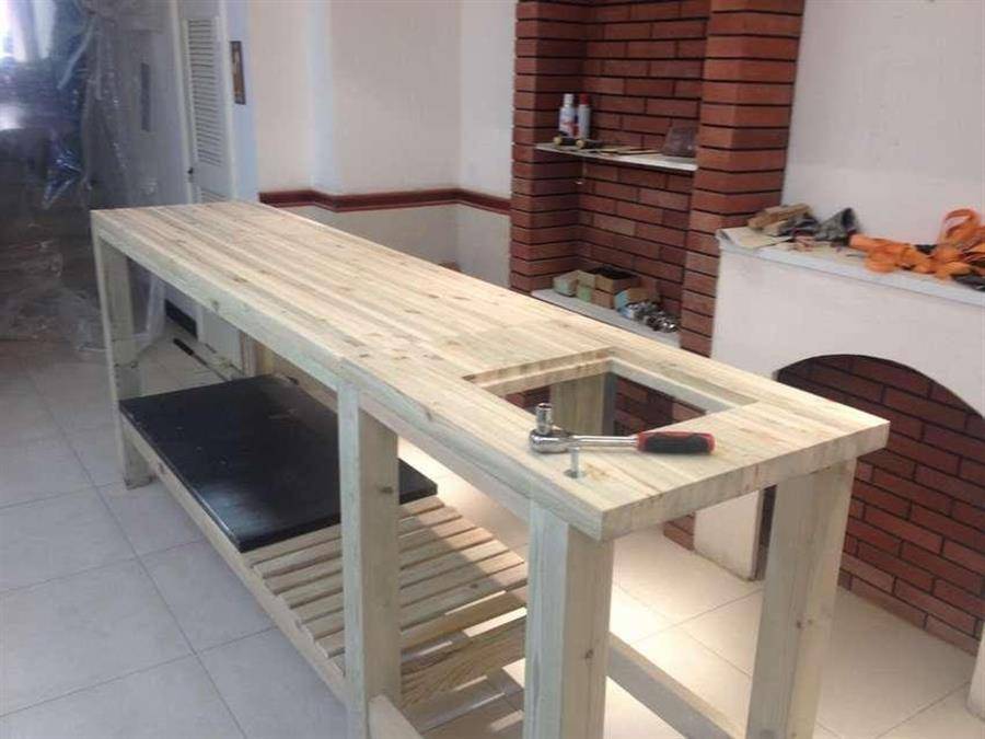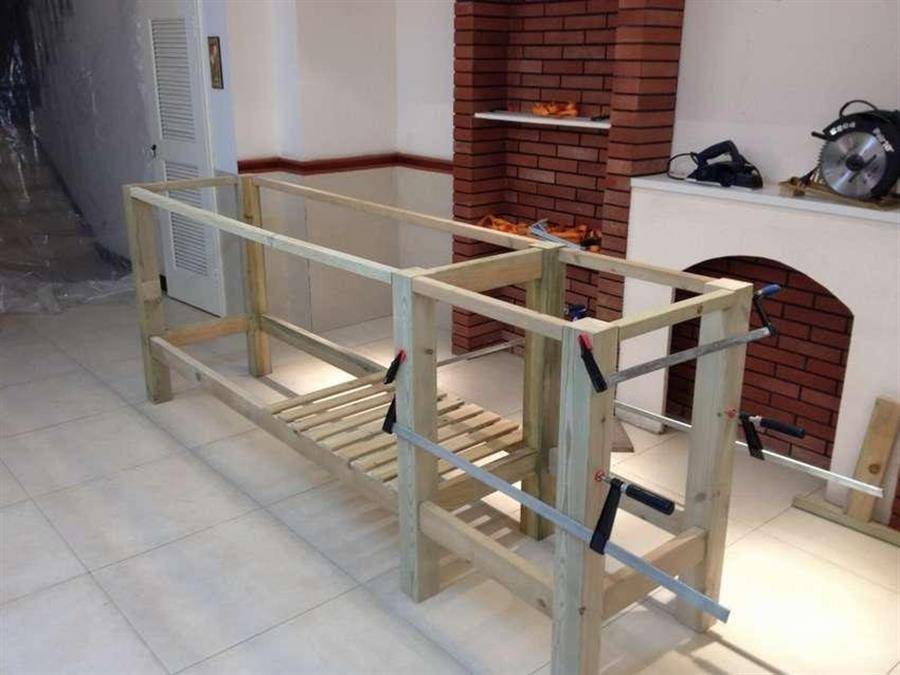 Чтобы усилить конструкцию, в верхней и нижней частях между ножками устанавливаются деревянные распорки. Нижние, которые располагаются на высоте 15 см от пола, можно применять в качестве основы для полки. Для сборки столешницы подойдет строганая шпунтованная доска из дуба или бука. Можно также использовать пару листов влагостойкой фанеры толщиной 1,8 см, которые проклеиваются между собой и обшиваются по краю.