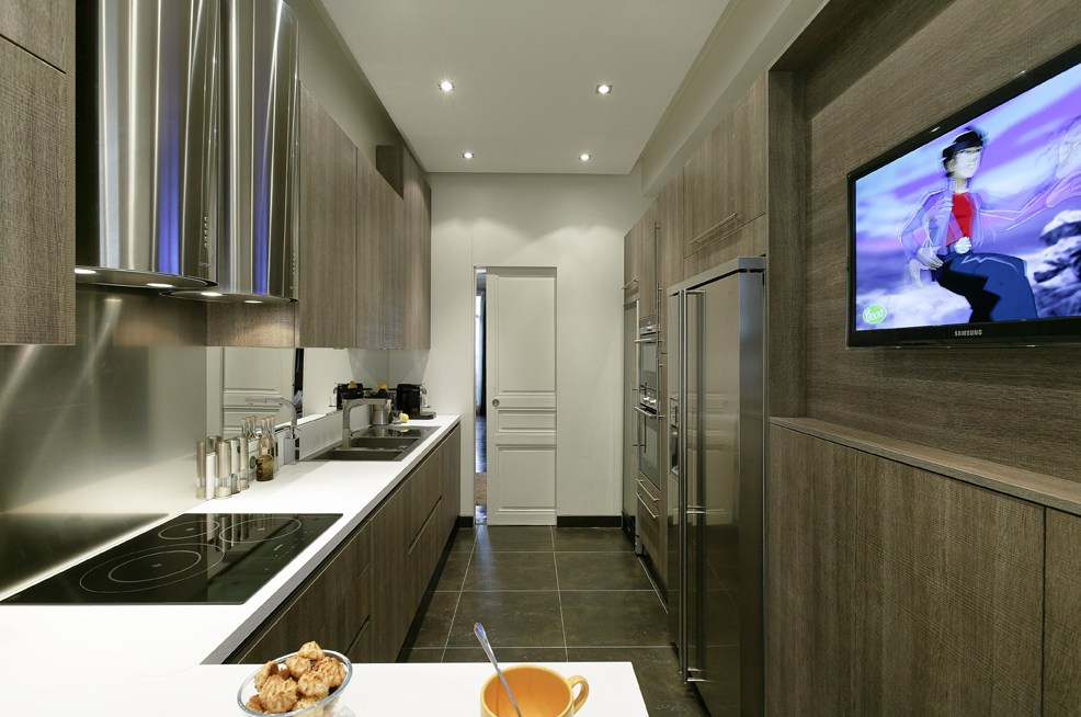 Длинный коридор предполагает размещение кухонной мебели, сантехники и прочего оборудования по одной стороне. Здесь также можно установить небольшой обеденный стол или модель-трансформер, которая будет раскладываться только во время приема пищи, а в сложенном виде не займет много места и не помешает передвижению в помещении.