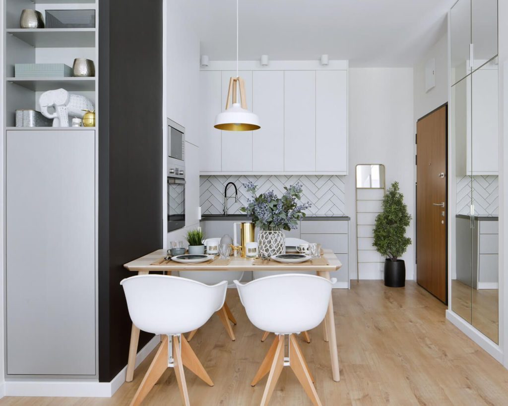 Если при ремонте совмещенной с прихожей кухни осталось место для обеденной зоны, ее можно подчеркнуть при помощи лаконичной подвесной люстры или каскадного светильника.