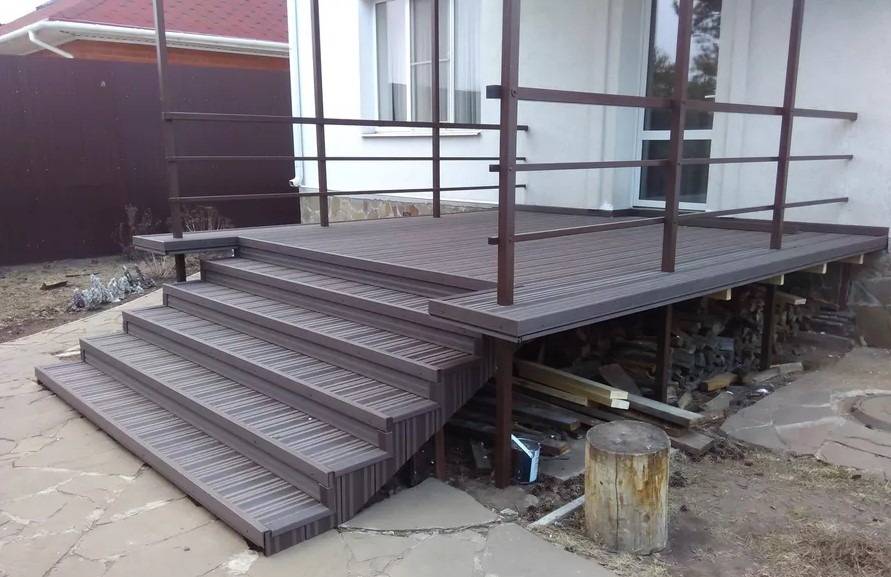 Для отделки уличных и домашних конструкций применяют террасную доску. Она не чувствительна к влаге, не боится огня. Материал хорошо поддается обработке — резке, сверлению, склейке. Из ДПК изготавливают проступи, ограждения. Крепят детали к каркасу специальными клипсами, торцы закрывают планками.