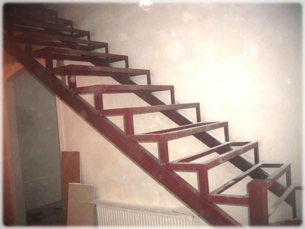 Тетиву можно собрать из профильной трубы 60х60 мм или уголка 45х45 см. Решетчатую конструкцию усиливают укосами и распорками. На них впоследствии крепят проступи и подступенки.