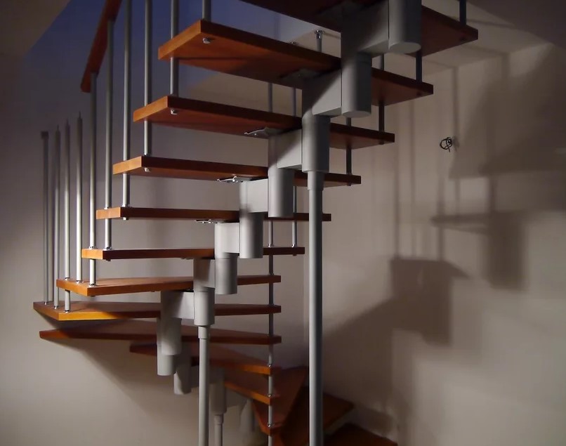 Когда мы думаем о винтовых лестницах из металла, первое что приходит в голову — это клинообразные ступени, которые расположены вокруг центральной опоры. Это самая распространенная конструкция, такого рода лестницы часто изготавливают при помощи модульного каркаса. Его отличительной особенностью является легкость сборки и относительная невысокая стоимость.