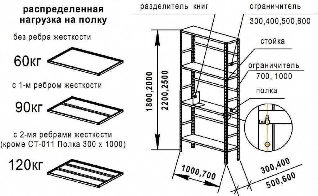 Чертёж металлического стеллажа и максимально допустимые нагрузки на него
