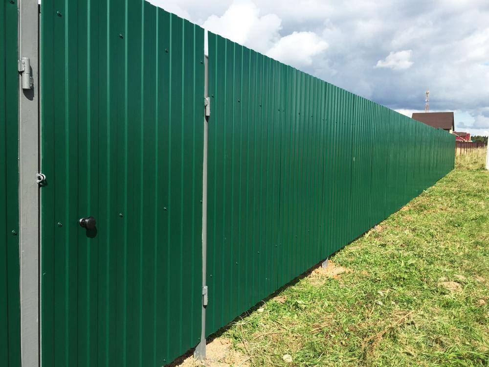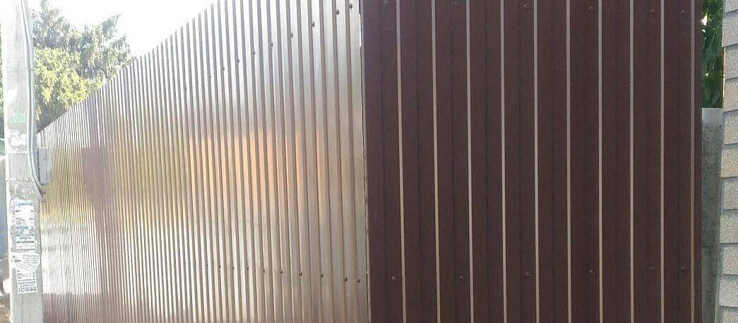 Глухие заборы для частного дома делают из стенового профлиста. Достоинства ограждения — большая цветовая гамма, многослойное защитно-декоративное покрытие, защищенность участка от проникновения, ветра и пыли со стороны дороги. Недостаток — высокие ветровые нагрузки (присущие для всех видов глухих пролетов).