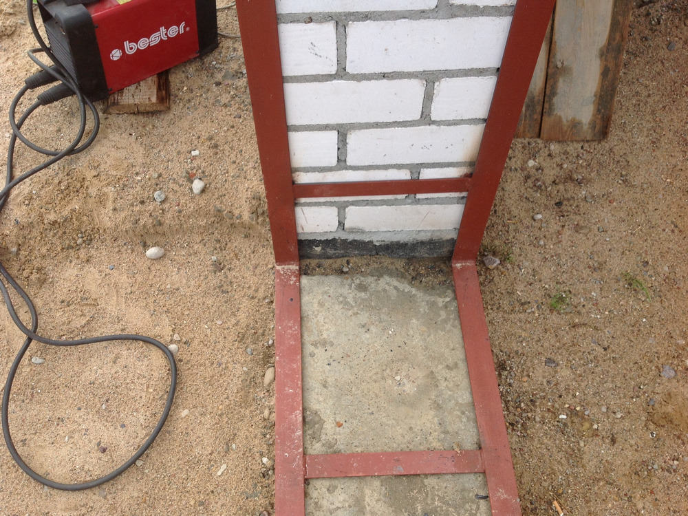 - Желательно сделать такую раму еще при возведении фронтальной стены. После того, как будет готова определенная часть кладки (50 см), работы по строительству стены требуется временно отложить для установки ворот.