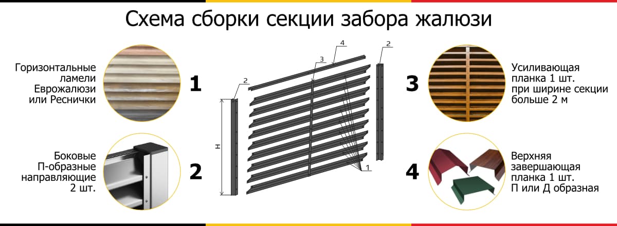 Забор жалюзи изготавливают из металла и дерева. Ограда продаётся в виде готовых отдельных секций. Вертикальная установка повышает уровень его безопасности, защищает от нежелательного шума со стороны улицы, особенно в ночное время суток. Металлический штакетник жалюзи рекомендуют устанавливать в следующих ситуациях: