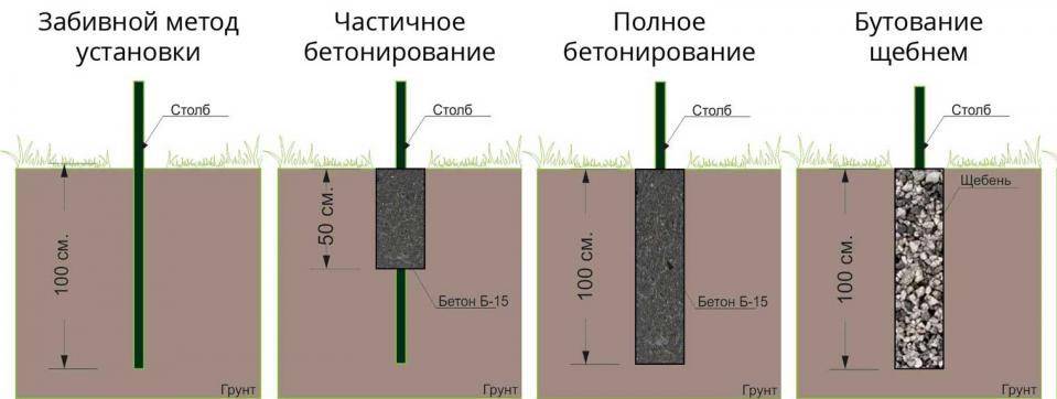 Можно выбрать деревянные брусья, металлические, асбестоцементные либо бетонные трубы. Их общая длина должна составлять подземную и надземную часть. Столбы вкапываются на глубину 1/3 от высоты опоры.