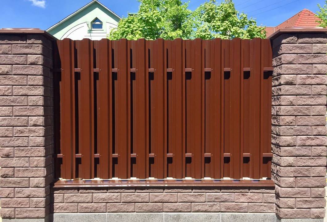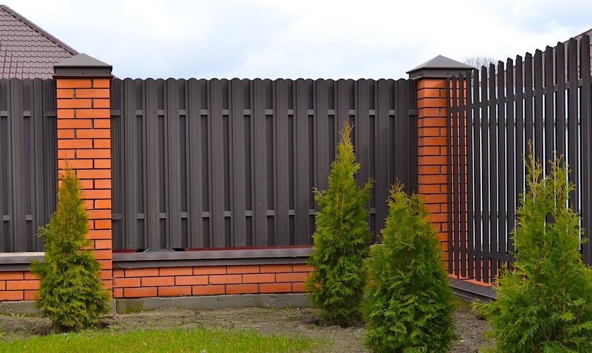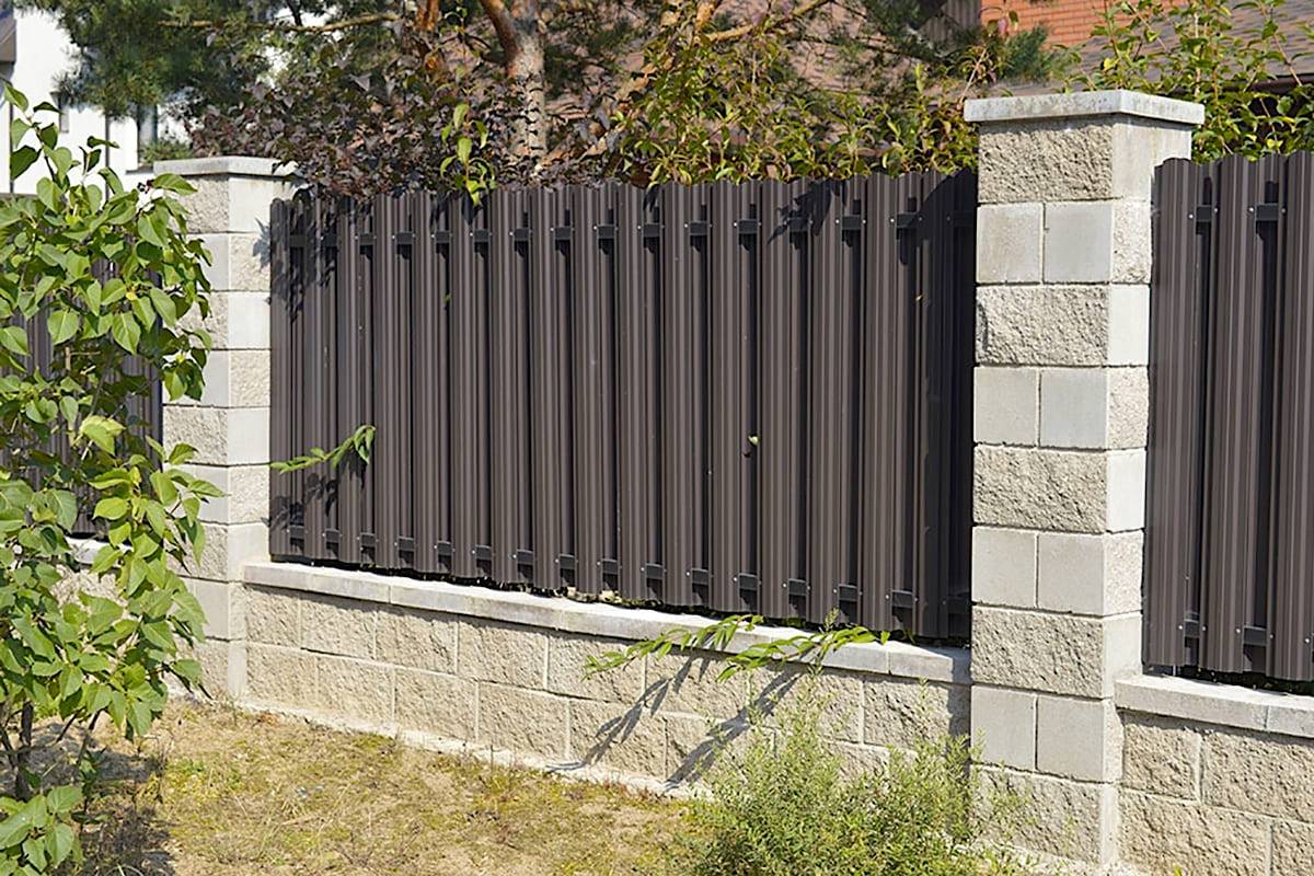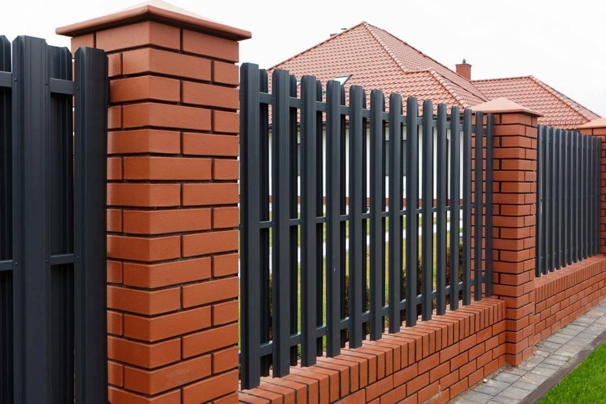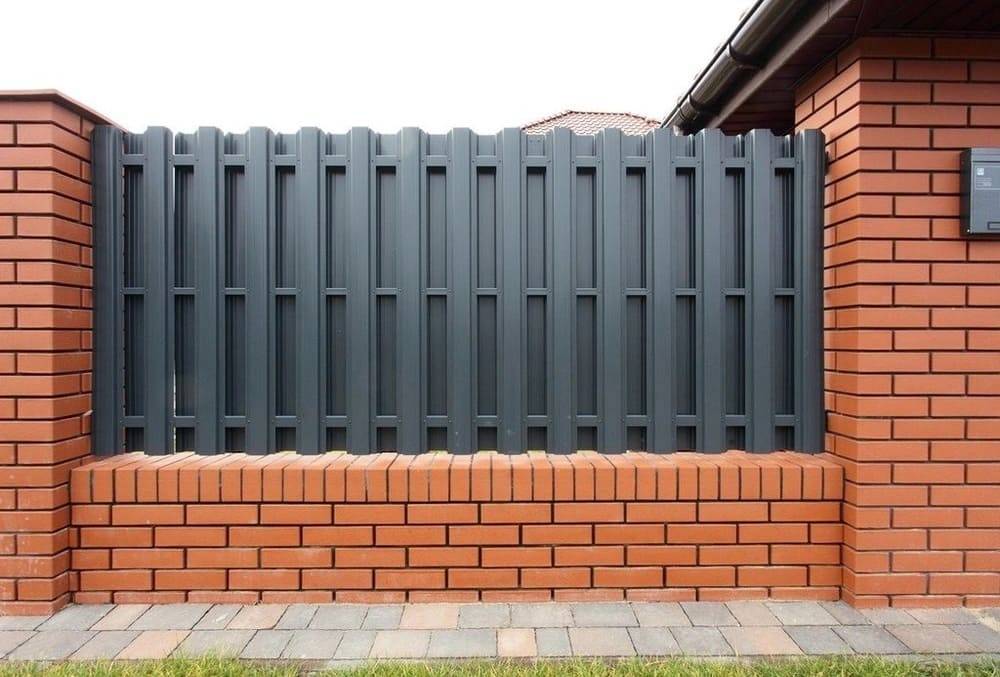 Для устройства красивого забора из евроштакетника можно использовать фундаменты ленточного типа с устройством цоколя из кирпича. Можно выполнить отдельные кирпичные столбы по фундаменту, а между ними устроить забор из металлического штакетника.