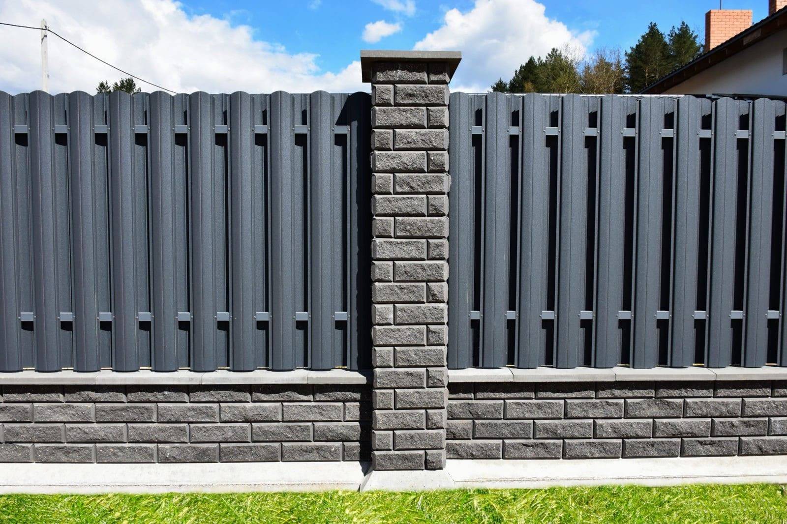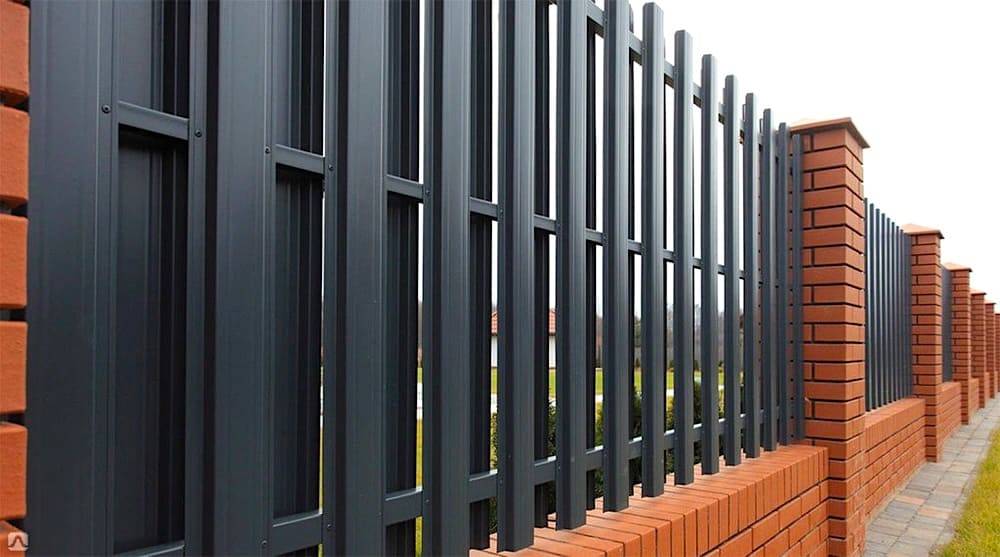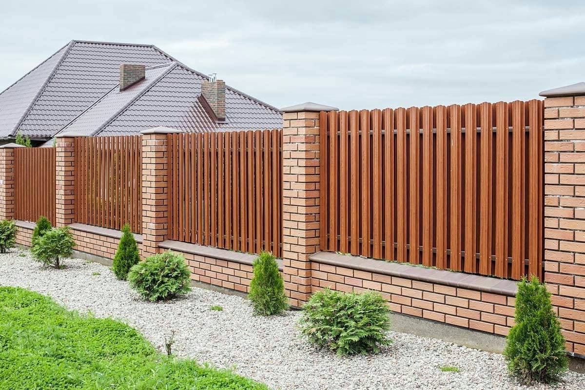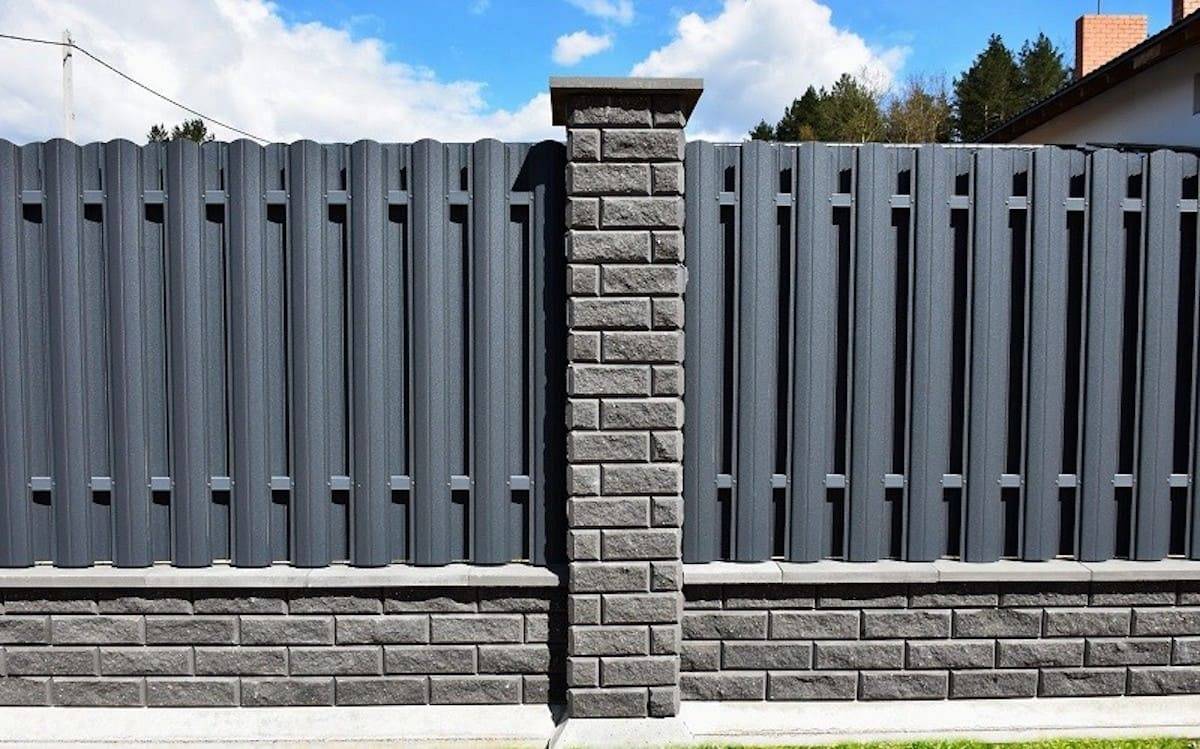 Для устройства красивого забора из евроштакетника можно использовать фундаменты ленточного типа с устройством цоколя из кирпича. Можно выполнить отдельные кирпичные столбы по фундаменту, а между ними устроить забор из металлического штакетника.