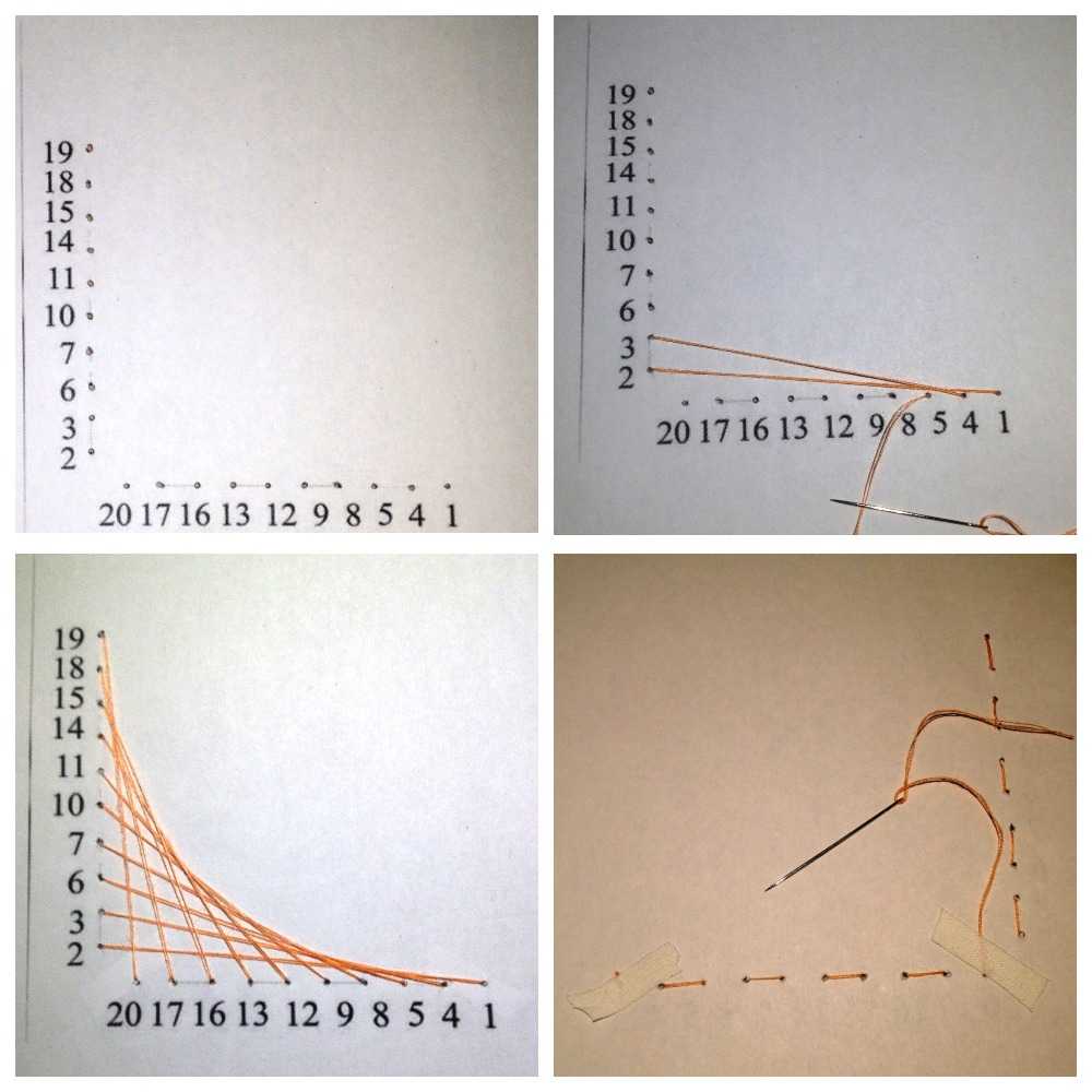 Начинать практиковаться в технике лучше с самого простого элемента – заполнения угла. Для этого упражнения нужно нарисовать на картоне любой угол: прямой, острый или тупой, и отметить на его отрезках точки, расположенные через равные расстояния, например, через 5 мм. Чем меньше расстояние между точками, тем декоративней получится рисунок.