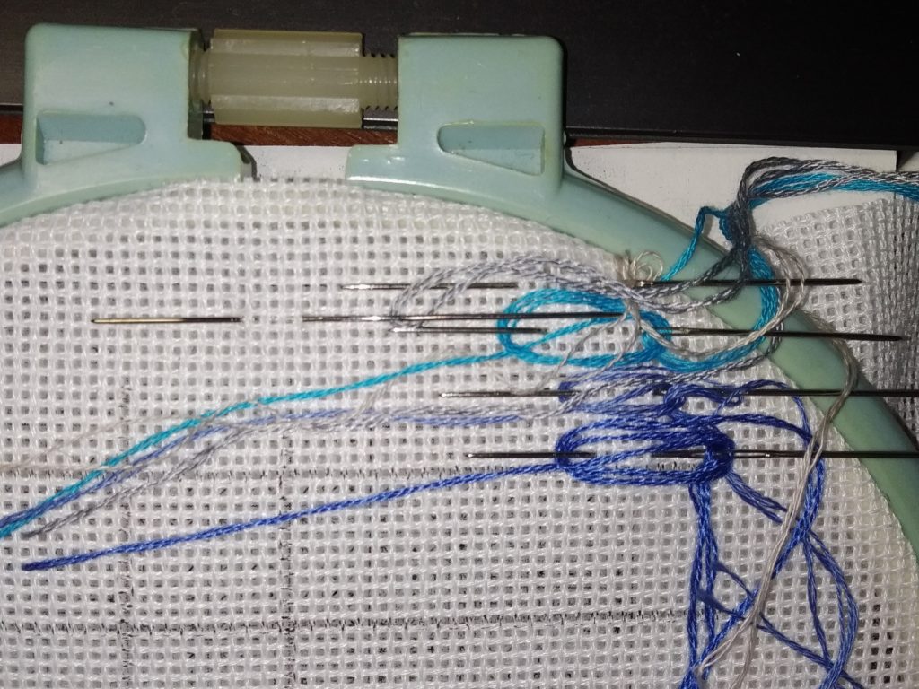 6. Для разнообразных оттенков используются свои иголки. На изделии будут припаркованные нити с иглами: сколько пряжи, столько и иголок.