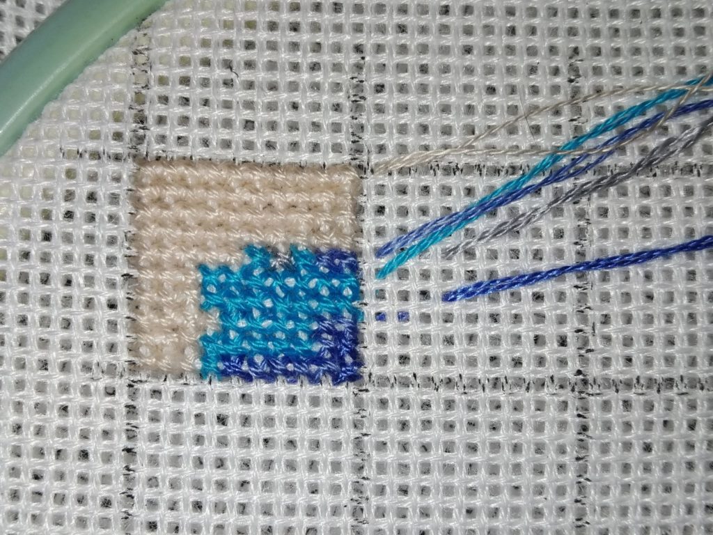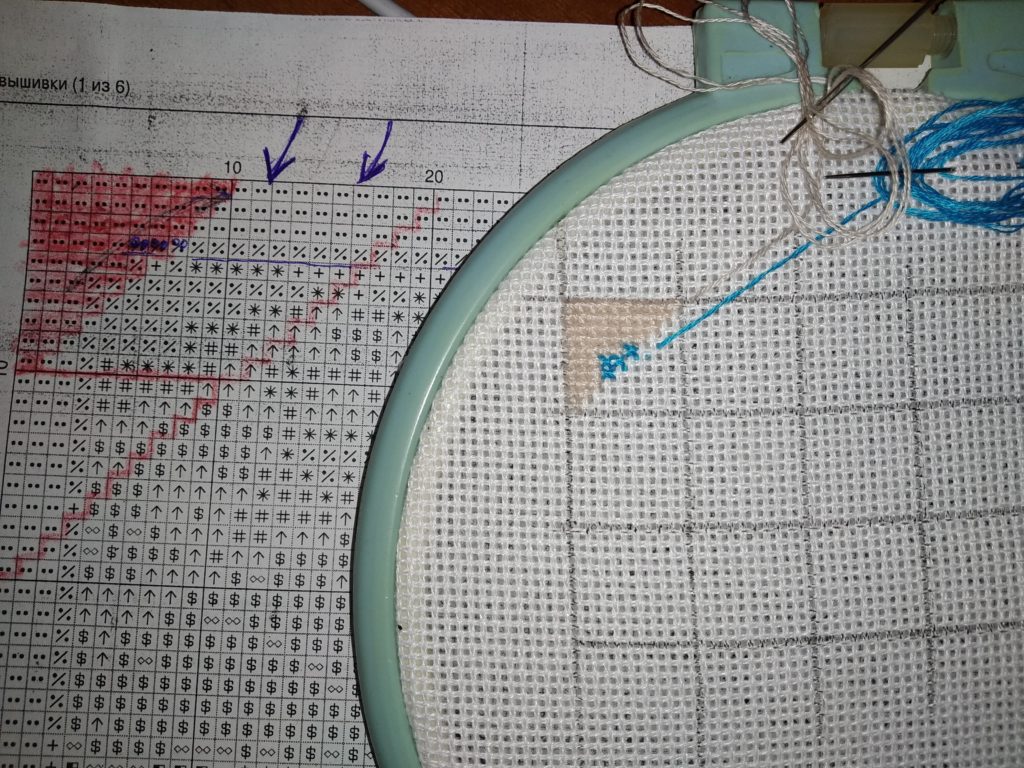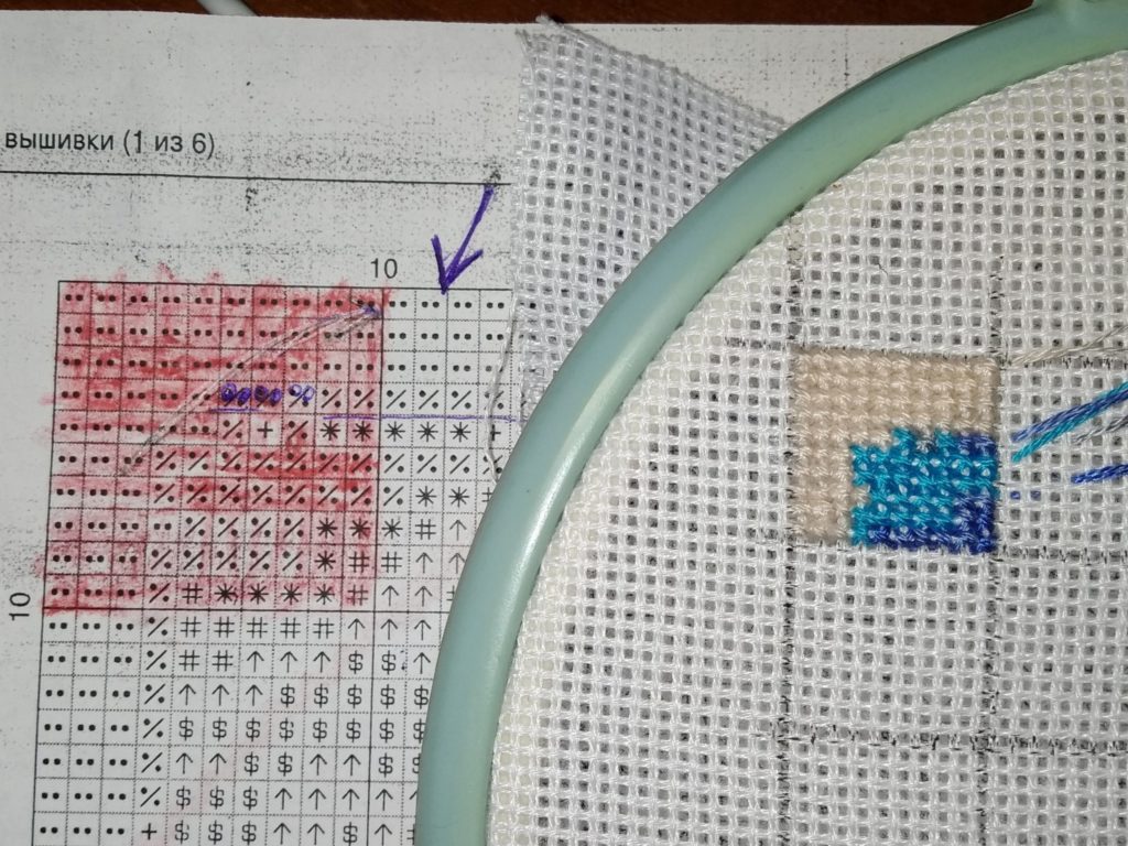 Бывают моменты, когда один-два квадрата выходят за границы первого участка, но больше этот цвет там не встречается. Не оставляйте их на потом, шейте сразу. Допускаются небольшие нарушения четких границ квадрата.