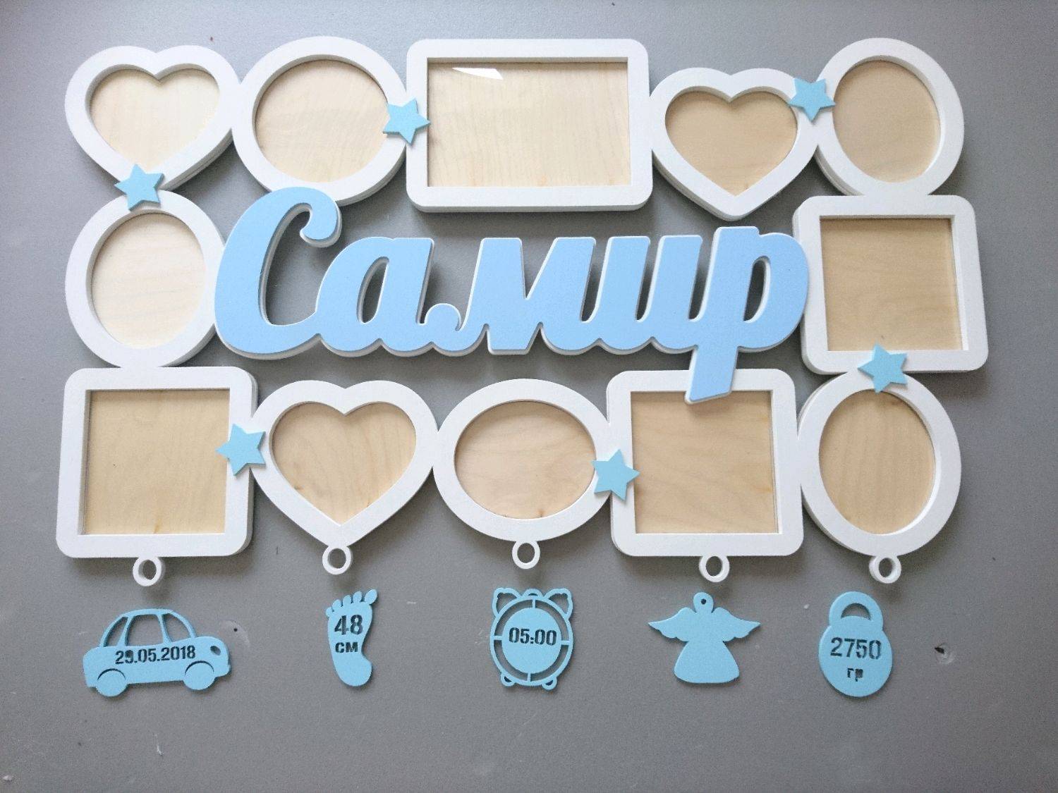 - Трафареты (имя ребенка, дополнительные элементы, например, в виде соски пустышки, гирьки, бутылочки, сердечка).