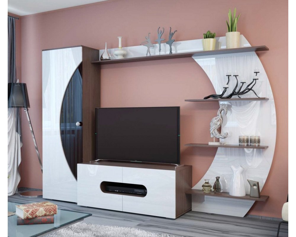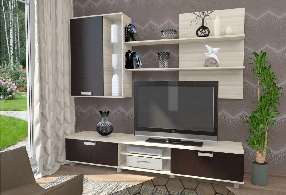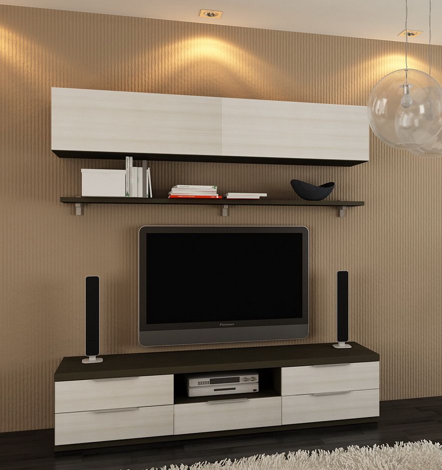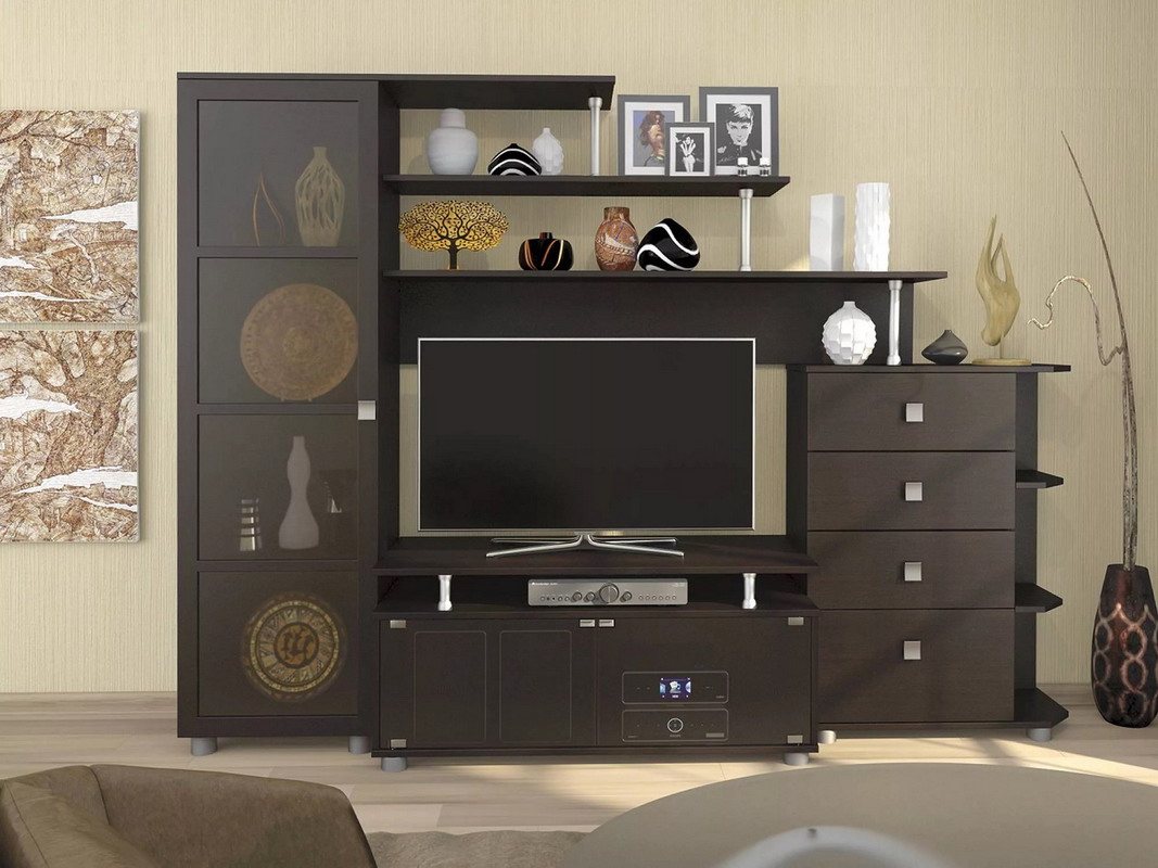 Обустройство мини-стенки. Он больше походит на формат прямой, но включает в себя модуль из мебели довольно узких размеров: стеллажа и тумбы. Подобная стенка чаще всего используется под телевизор со стереосистемой, с различными сувенирами, а иногда вместе с тумбой оборудуются просто небольшие полки или обычная этажерка.