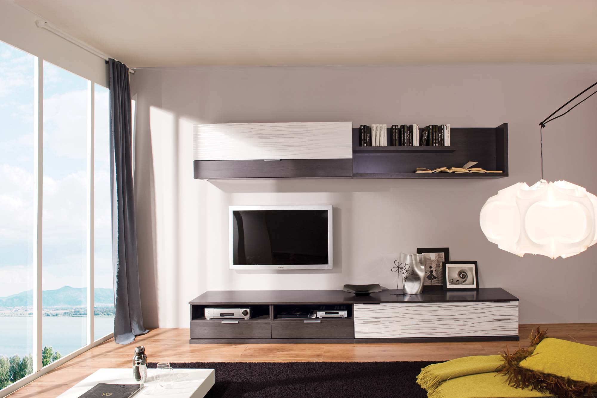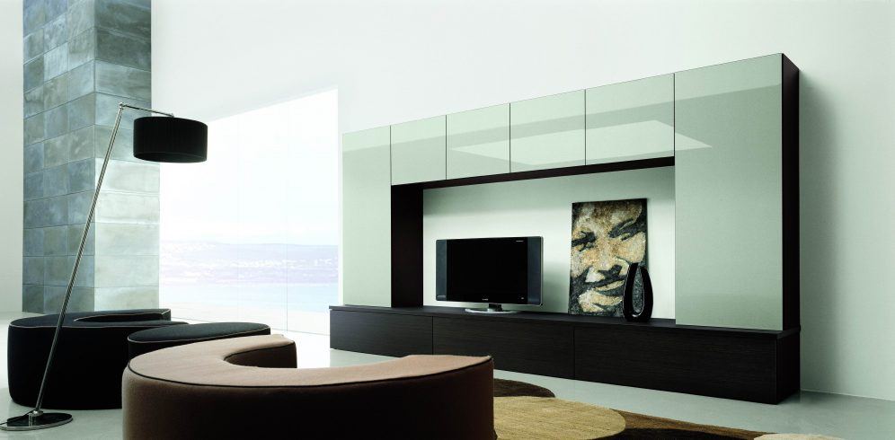 Каждая часть модульной гостиной является взаимозаменяемой и совершенно все детали можно менять местами между собой, а также убирать и перевешивать. Даже при таких манипуляциях конструкция останется неизменной на вид. Среди элементов таких конструкций находятся шкафы подвесного типа, напольные тумбы, полки под ТВ и витрины.