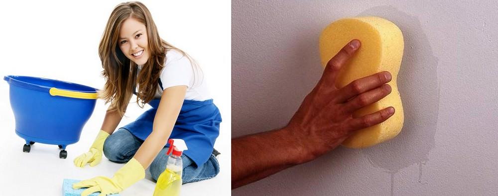 - В препарате смочить мягкую губку, хорошенько отжать и протереть всю поверхность полотен (на обоях не должно быть потеков).