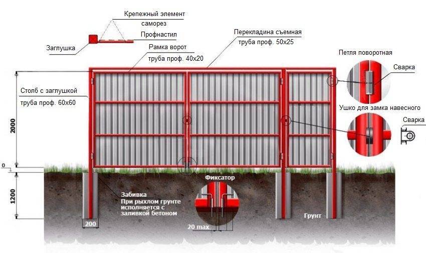 Перед началом строительства необходимо правильно рассчитать все замеры, длину и толщину труб. В качестве столбов обычно используют профилированные трубы с сечением 60х60х3 мм.