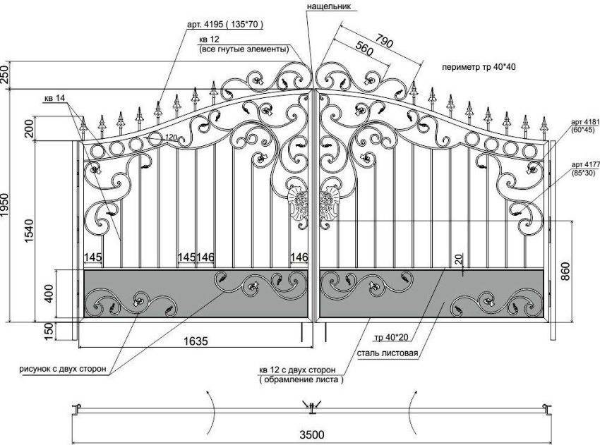 - Чертежи калиток должны включать данные о размерах, расположении петель, лаг, перекладин, замка, задвижки, ручки, глубины установки опор в грунт;