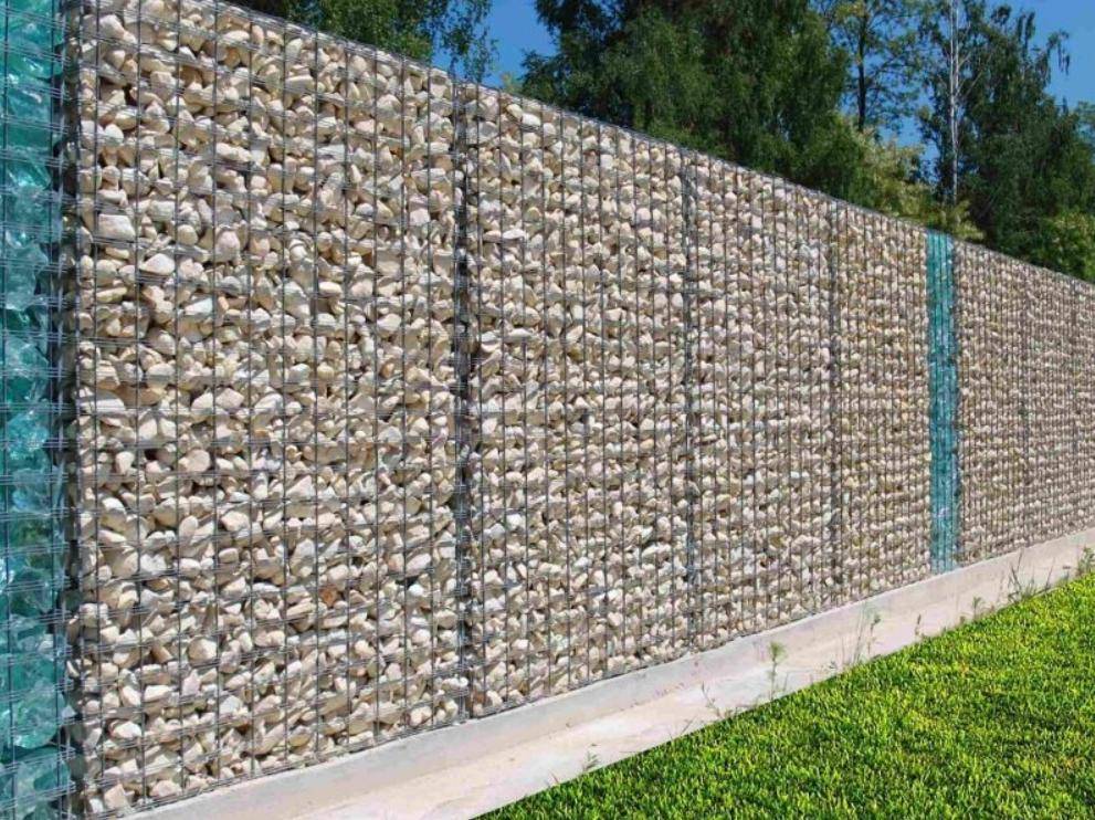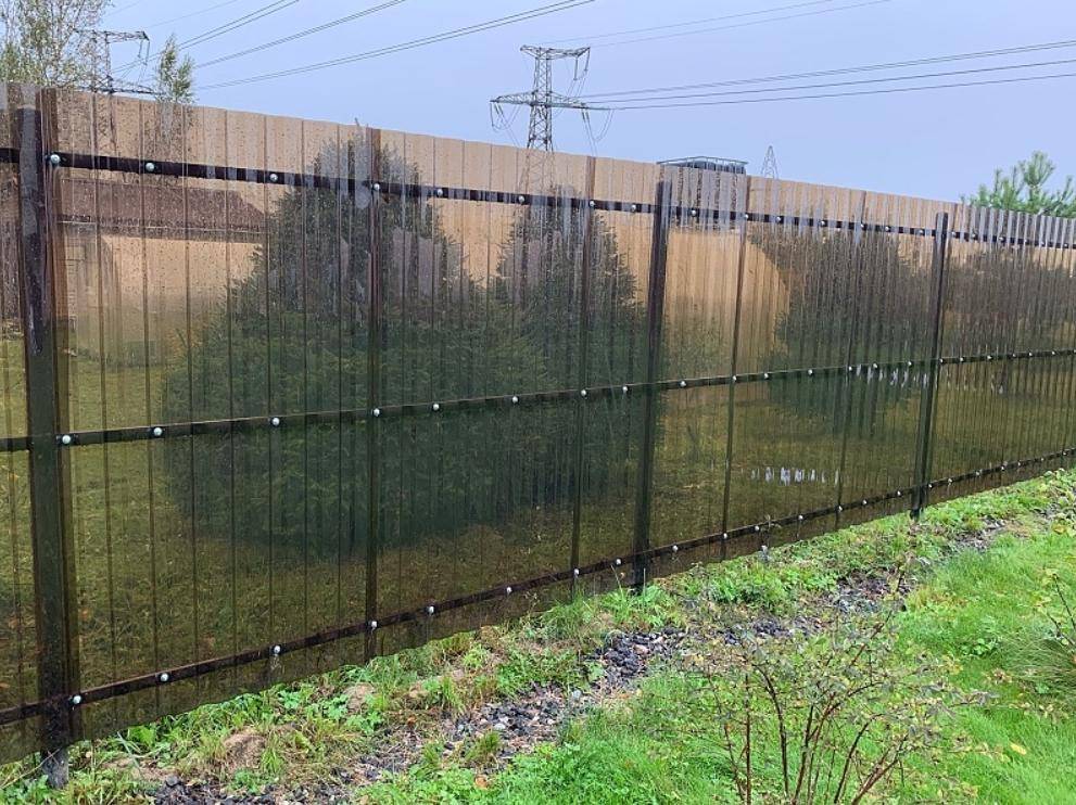 Прочный полупрозрачный материал, напоминающий стекло, крепится на опорных столбах и фундаменте с обязательной металлической окантовкой. Хорошо защищает от неблагоприятных погодных условий, не затеняет территорию, усиливает шумоизоляцию. Подходит для ровных участков, гармонирует с простыми архитектурными решениями в современном стиле. Лучше использовать за городом.