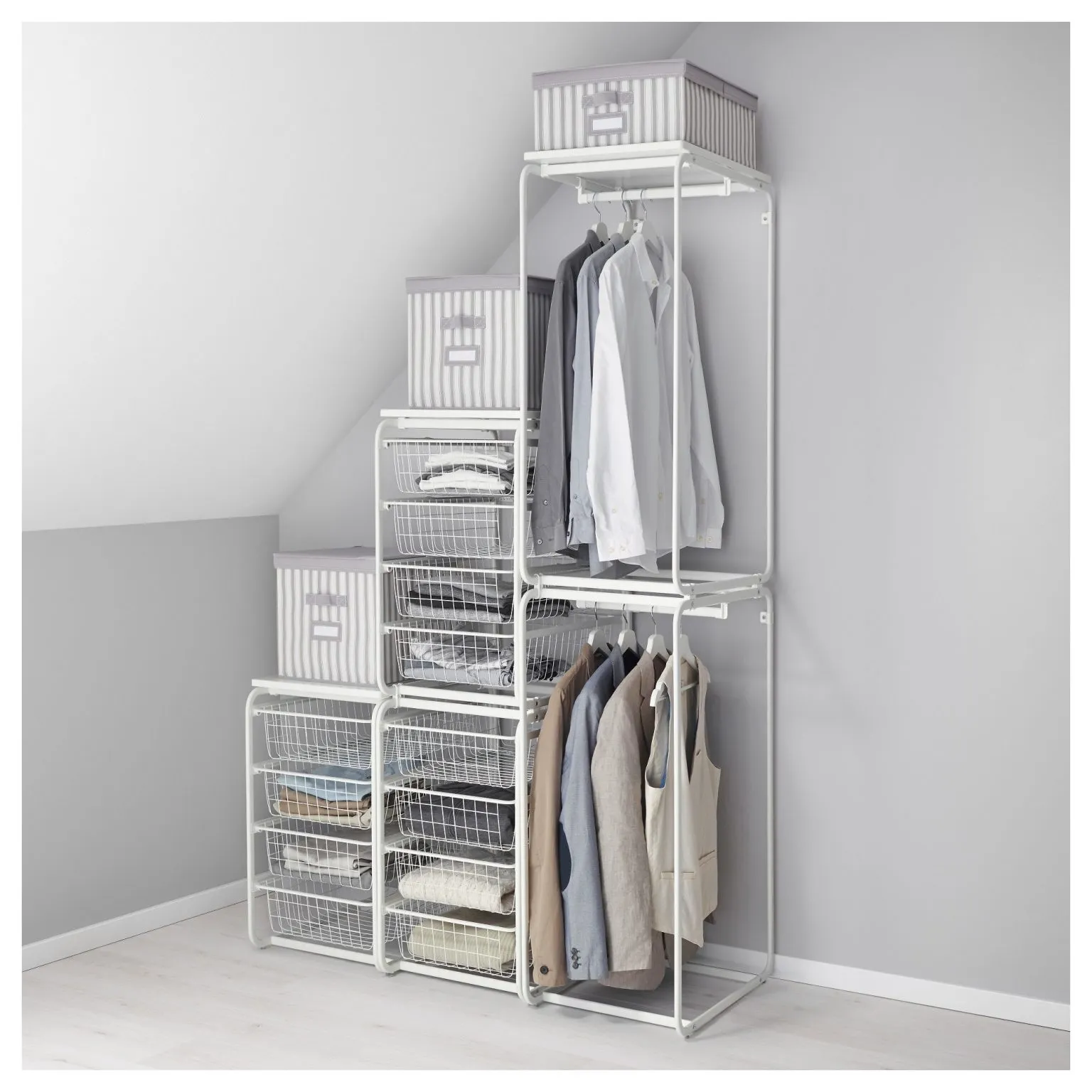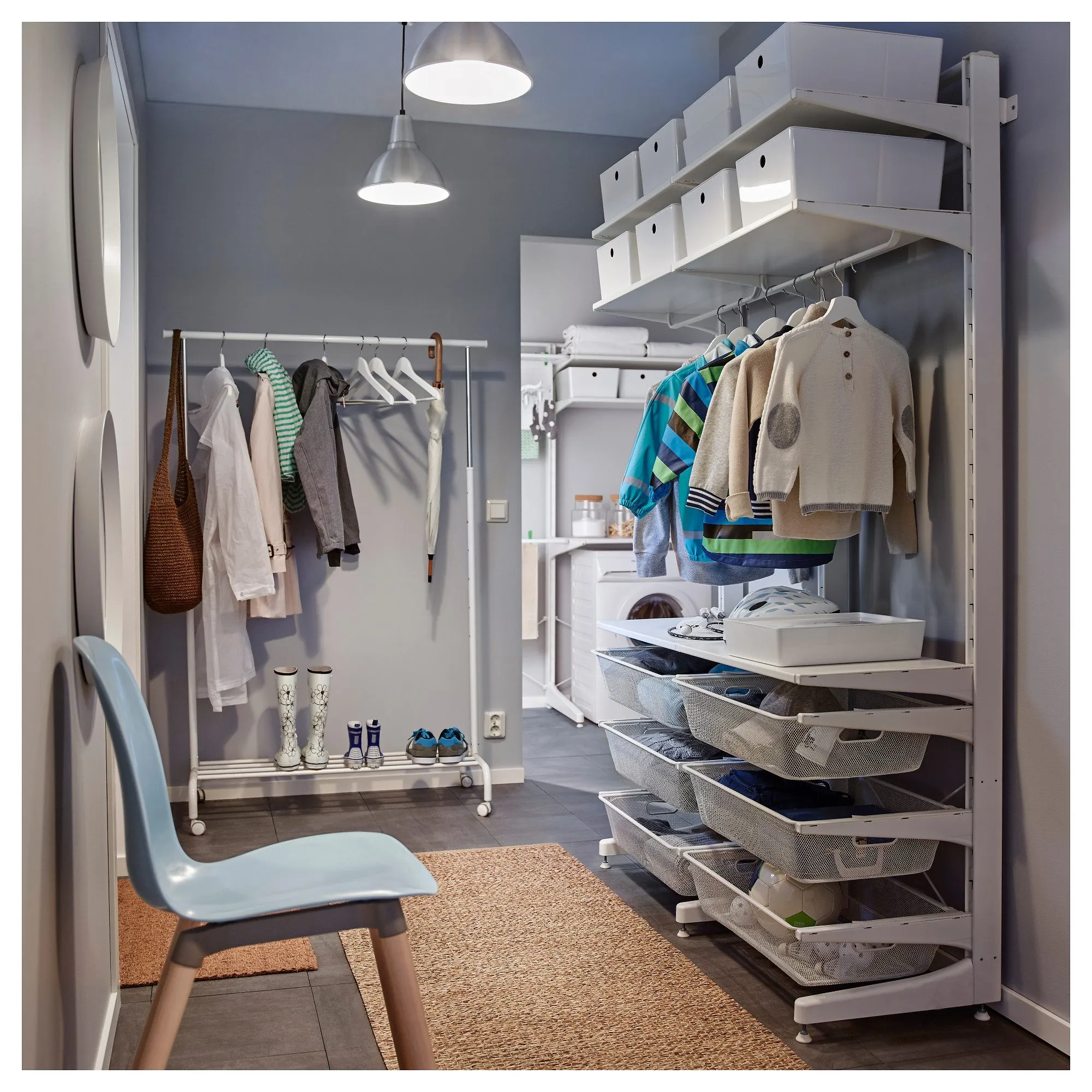 Такие системы можно устанавливать в гардеробной комнате. Благодаря вместительным корзинам там можно хранить множество вещей.
