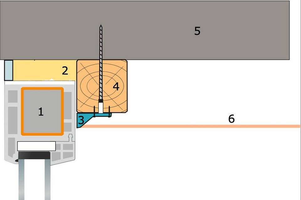 Вариант примыкания натяжного потолка к балконному остеклению: 1 — пластиковая оконная рама; 2 — оконный монтажный шов; 3 — потолочный багет; 4 — деревянный брусок; 5 — плита перекрытия; 6 — полиэфирное полотно