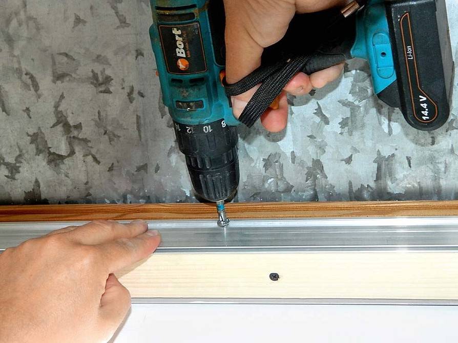 4. Монтаж профиля для крепления пленки или тканевого полотна. Багеты прикручиваются саморезами с шагом от 7 до 12 см на прямых участках и через 1-2 см на изгибах к потолочным балкам, стенам из ровных материалов (включая обшивку из ГКЛ) или подложке по периметру стен поверх оцилиндрованных бревен. После их фиксации обязательно проверяется ровность и устойчивость каркаса.