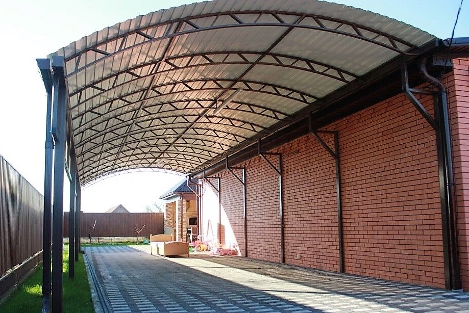 Наиболее популярным на сегодняшний день является арочный тип изделия. Сделать его намного сложнее, чем одно- или двускатный, но зато смотрится он очень эффектно. Такой навес строится отдельно от дома или примыкают его боковой частью.