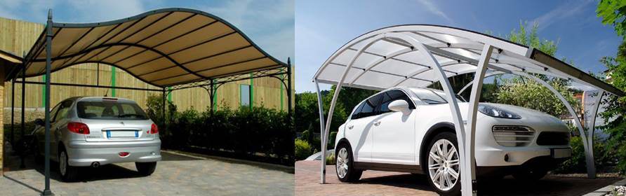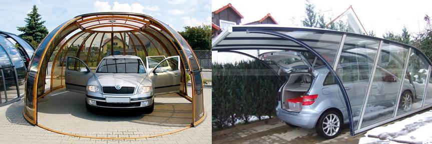 На фото ниже представлены две конструкции из поликарбоната, настоящее чудо, которое стоит больших денег. Навес в форме купола спасет машину от любых осадков, даже от косого дождя. При этом навес достаточно большой, удобно открывать двери и багажник машины. Главное найти площадку под такой навес для автомобиля.
