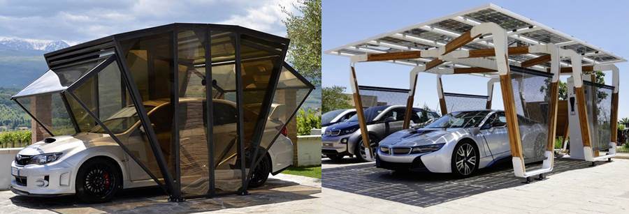 Навесы для машин на следующей картинке тоже весьма необычны. Навес слева представляет собой конструкцию из металла и пластика, которая автоматически сдвигается и раздвигается