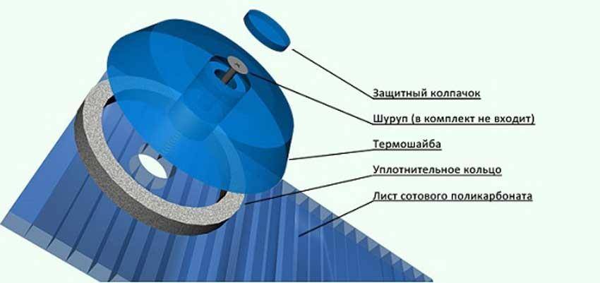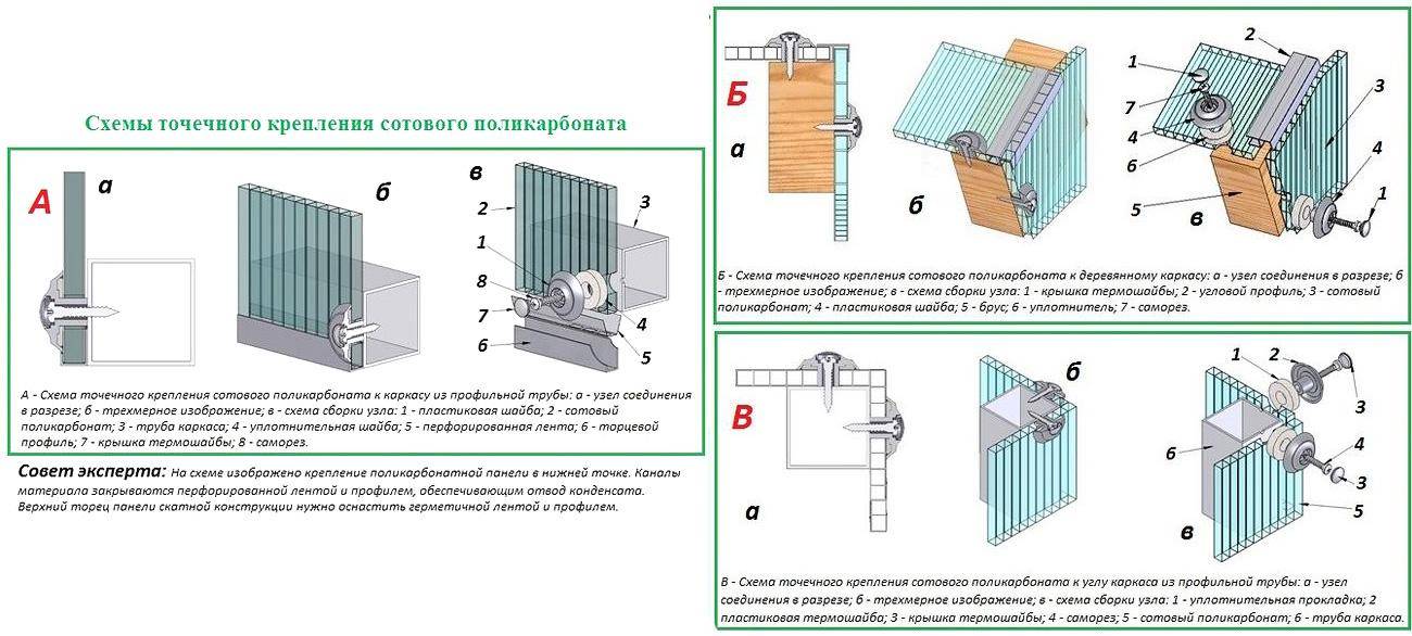 Чтобы соединить листы используется стыковочный профиль. Перед тем как закручивать саморез, предварительно просверлите в поликарбонате отверстия. Они должны быть немного больше диаметра самореза. Закручивать саморезы следует через специальные шайбы, имеющие резиновую прокладку