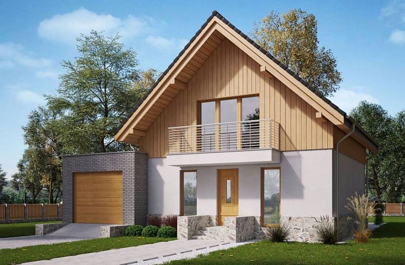 Дом с гаражом и мансардой небольшой площади — это достаточно удобный современный проект. В нем на первом этаже размещается гараж, а на втором зона для проживания.