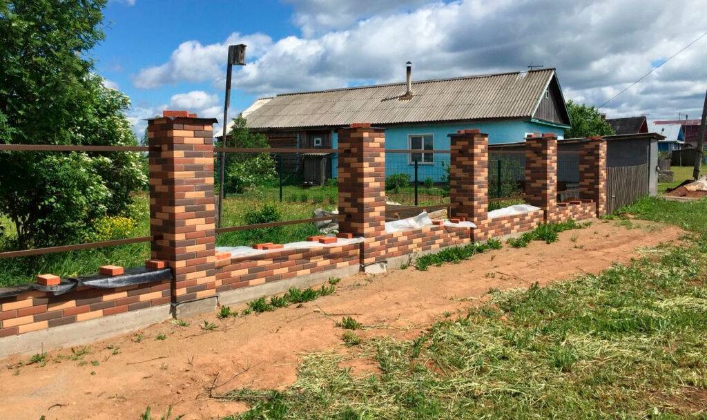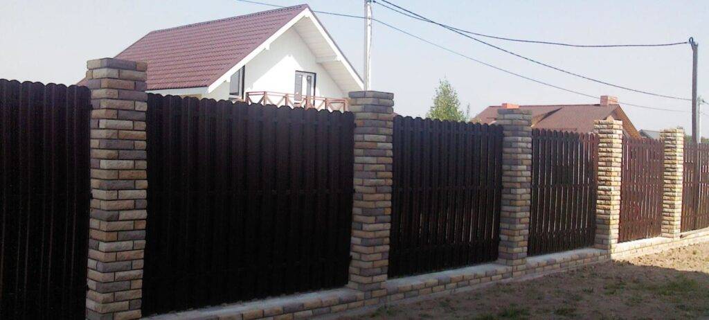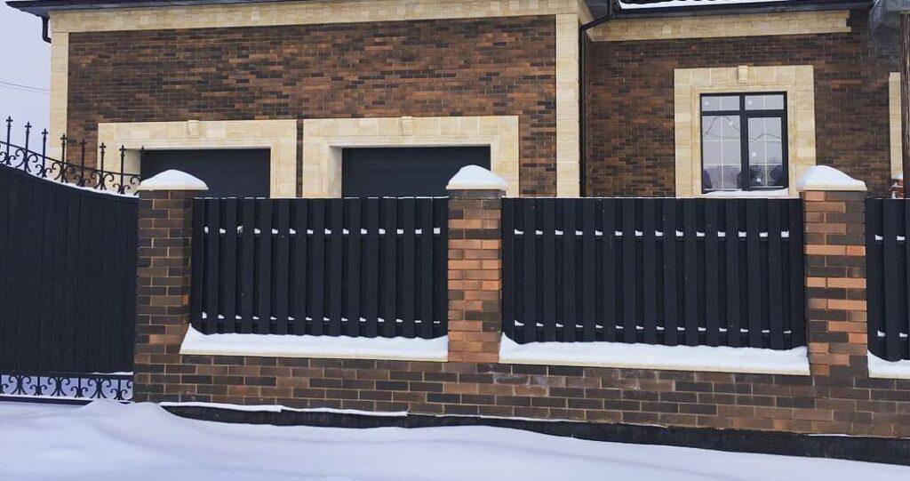 Возникает надежная опора для всех элементов — трубы становятся основой для кирпичных столбов, а горизонтальные участки удерживают кладку нижних частей секций забора. Этот вариант можно использовать даже на рыхлых грунтах, если выбрать большую глубину погружения опор (или заменить их винтовыми сваями).