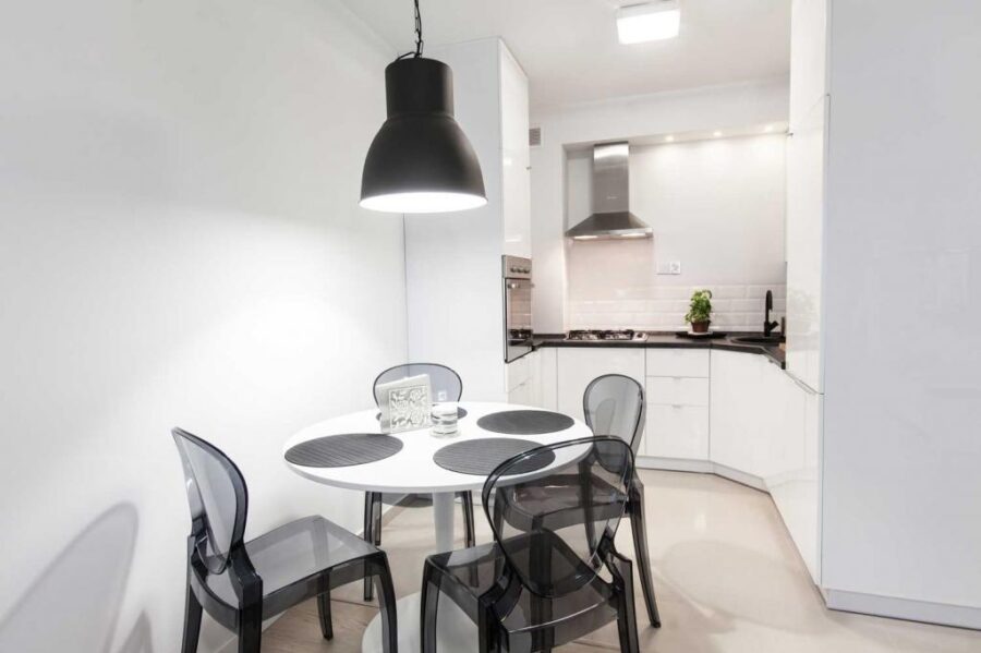 Прозрачные пластиковые стулья – находка для маленьких кухонь-столовых