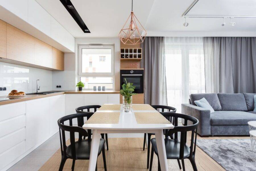 Объединять гостиную со столовой – востребованное дизайнерское решение для экономии места в квартире. Такая перепланировка связана с частичным или полным сносом стены. Зал вместе с мебелью плавно переходит в кухню со столом.