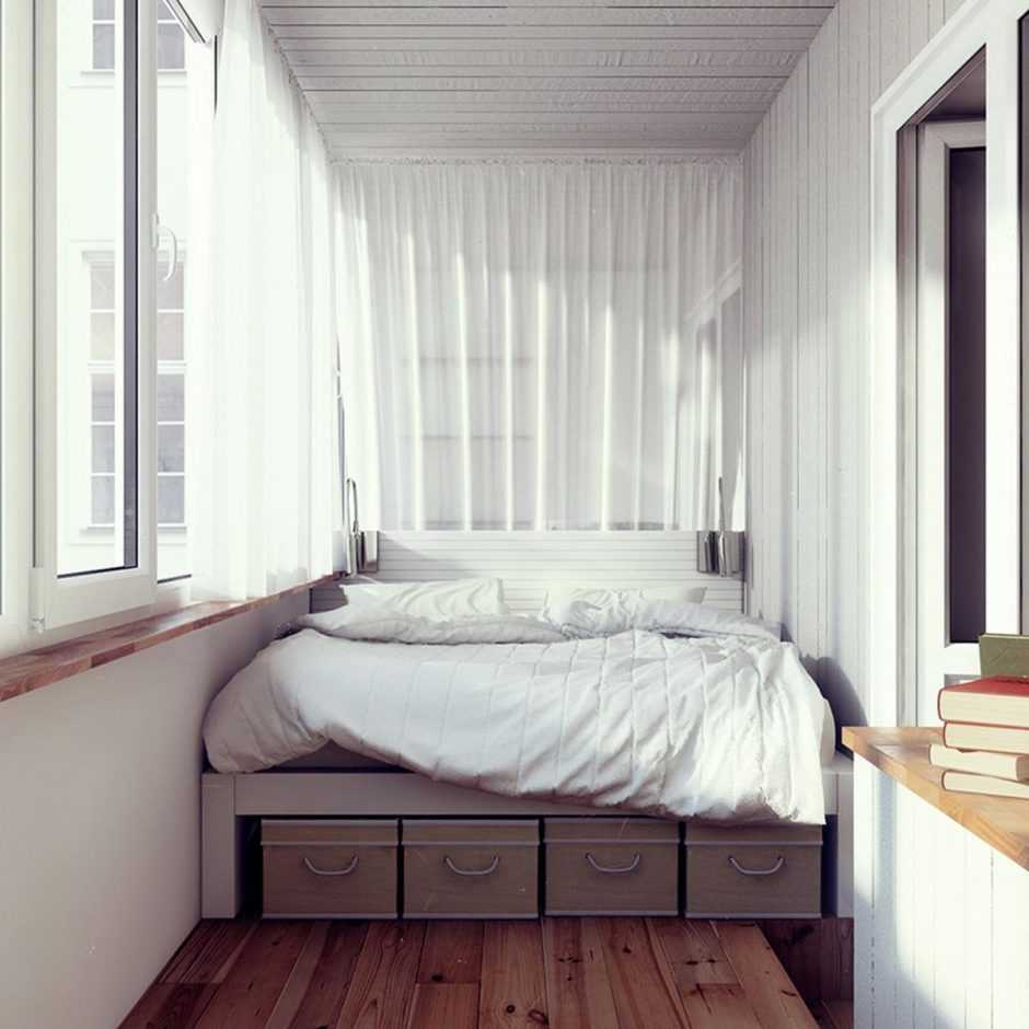 Хоть специалисты и не рекомендуют, однако смелые личности могут вынести зону сна на панорамно остекленную балконную часть спальни. Вообще-то там лучше разместить просто дополнительное спальное место, причем поставить его на подиум. Роль кровати в данном случае может выполнить раскладной диван, футон, надувной матрас.