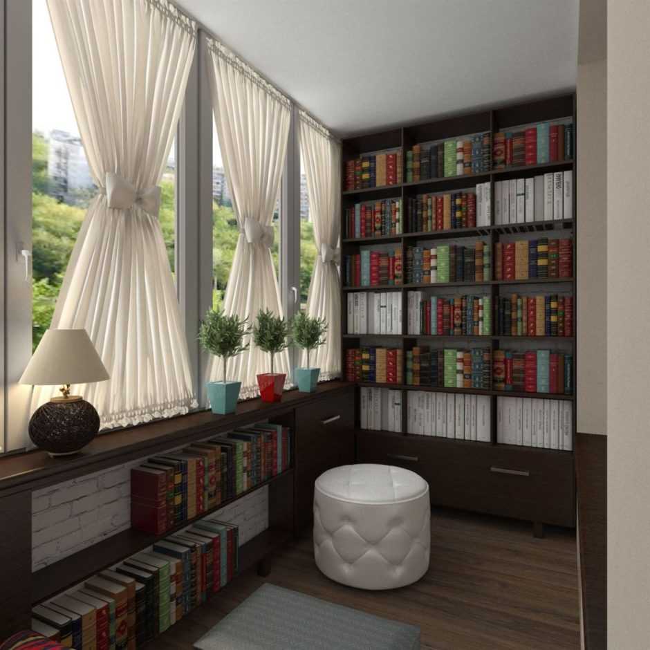 Всегда мечтали о личной библиотеке? Объединение спальни и балкона даст шанс ее заполучить. Для хранения книг используйте навесные полки или стеллажи. Для комфортного чтения можно поставить уютное глубокое кресло или кресло-качалку, рядом с которым расположить стоящий на одной фигурной ножке круглый столик и торшер.