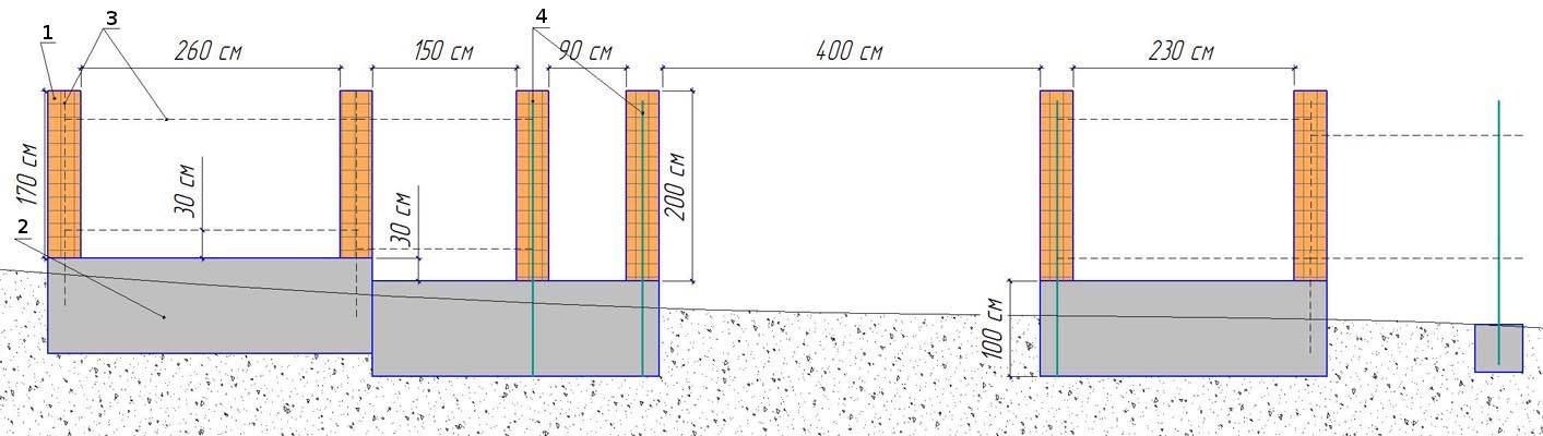 - Пролёт между столбами опоры может быть от 2,5 м до 5. Его продолжительность зависит от предполагаемой высоты и особенностей конструкции кирпичного забора.