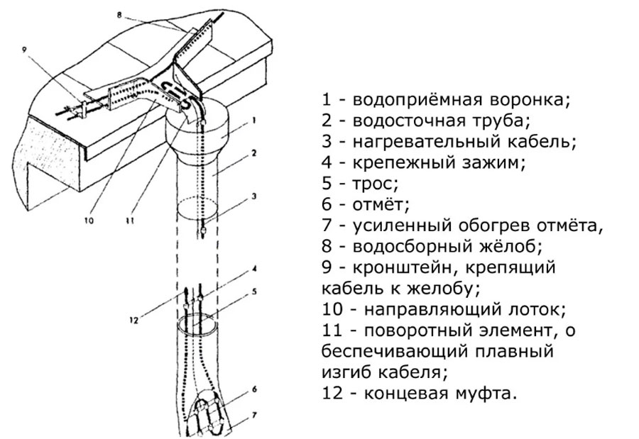 Важно знать, какую мощность выдает кабель на метр своей длины. После этого подсчитывается длина всех желобов и вертикальных сточных труб, что позволит определить мощность кабеля по всей их длине. Рекомендуется укладывать не одну жилу большой мощности, а несколько жил меньшей мощности, чтобы добиться требуемого результата