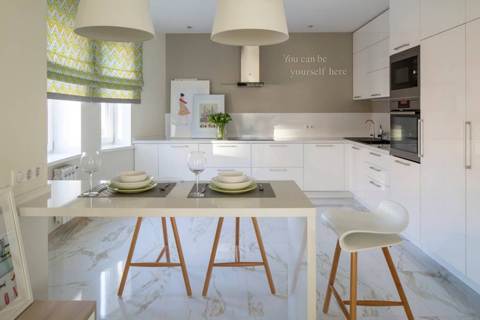 А вот для обеденной зоны оригинальный рисунок пригодится. Он придаст простому и скромному участку помещения праздничный вид. Учитывая особенности комнаты, эксперименты с цветами допускаются самые неожиданные, пока белый цвет в интерьере остается ведущим.