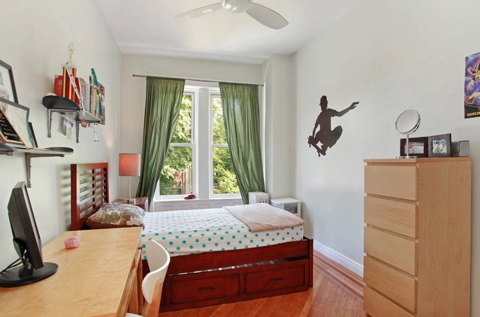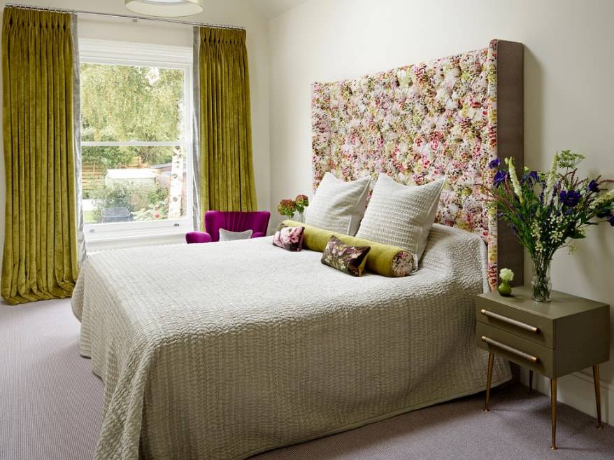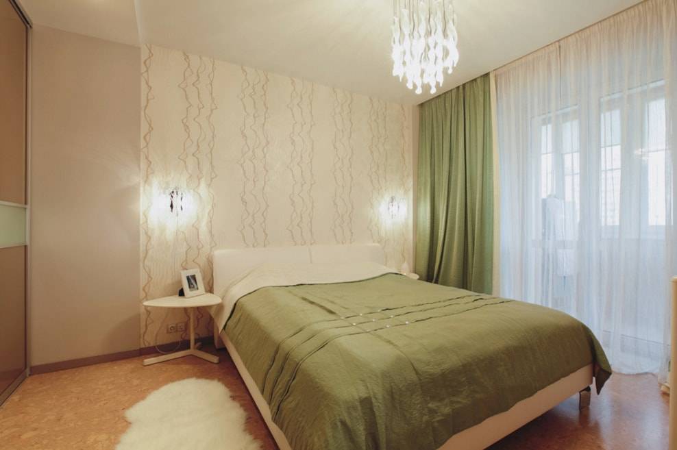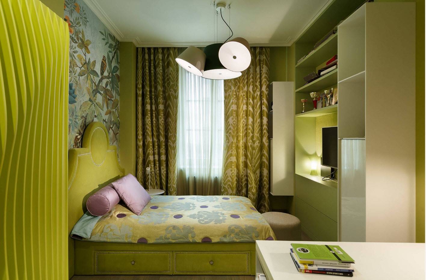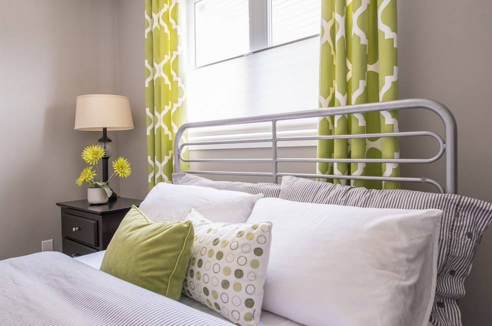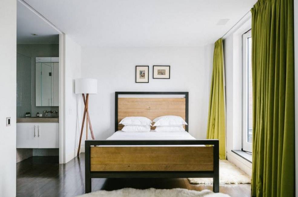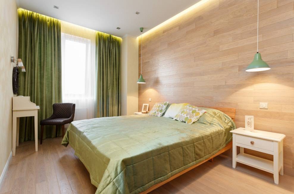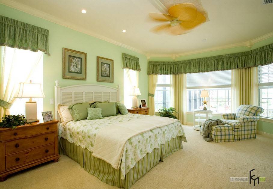 Спальня со шторами зеленого цвета