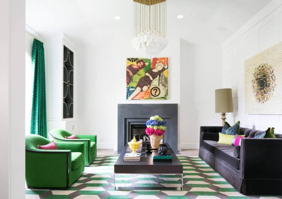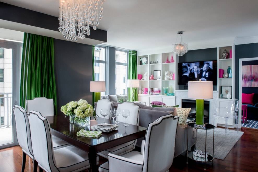 В то же время очень важно соблюдать баланс, чтобы гостиная не была слишком темной или светлой. Намного лучше смотрится нейтральный дизайн с яркими акцентами в виде штор зеленого цвета. При условии правильного выбора оттенка и фактуры они придадут комнате легкость и свежесть