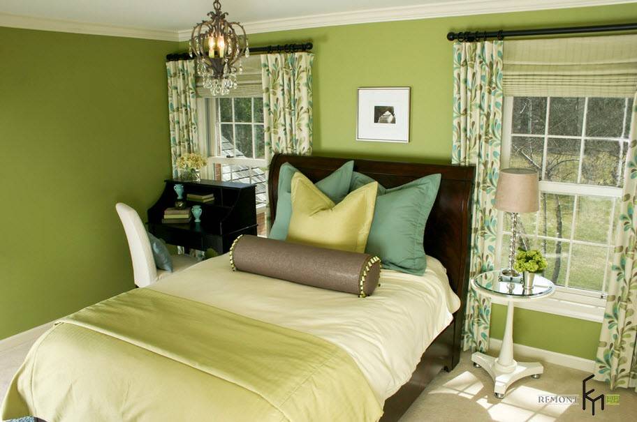 Очень часто спальню полностью оформляют в разных оттенках зеленого. Смотрится это довольно интересно. Но подойдет такое решение только тем, кто очень любит этот цвет, так как через время он может начать утомлять. В качестве альтернативного варианта предлагаем использовать два комплекта штор: белые и зеленые. Периодически меняйте их, чтобы не привыкать к одной и той же палитре.