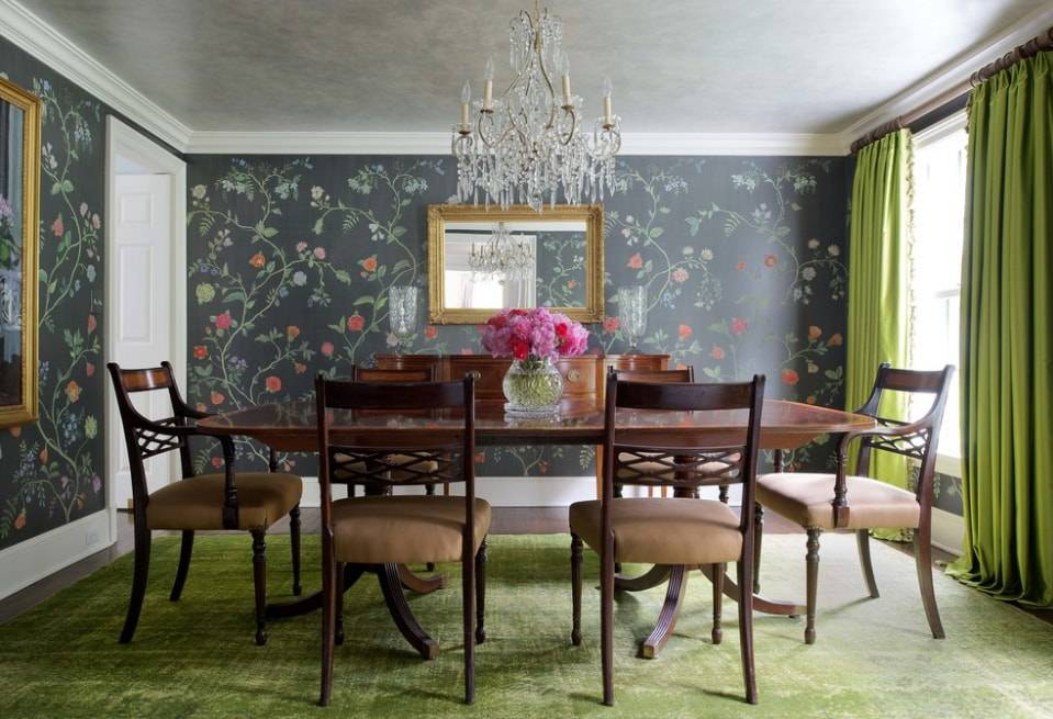 Хорошо выглядят зеленые обои с узором, особенно в классическом стиле. Рекомендуется купить при этом деревянную мебель — такой дизайн перенесет вас ближе к природе.