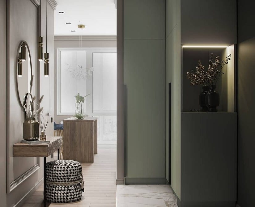Зеленая прихожая с порога поможет создать приятное впечатление о всем доме. Так как в это пространство редко попадают лучи солнечного света, то лучше остановиться на светлых оттенках. Впрочем, все зависит от дизайна: при наличии продуманной системы освещения хвойные или даже болотные разновидности будут выглядеть подходяще, особенно при сочетании с более светлыми цветами.